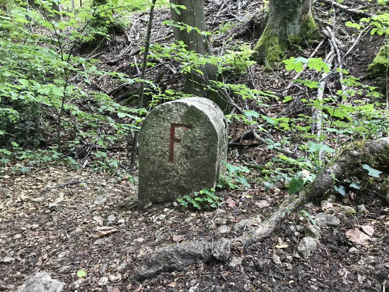 Nach dem Restaurant ‘Bergmatten’ steigen wir noch bis zum Blauenpass (820 m). Hier haben wir (fast) den höchsten Punkt unserer Wanderung erreicht. Nun geht es für eine zeitlang flach weiter. Breite und engere Waldwege folgen. Die bieten eine weite Sicht nach Frankreich oder nach Süden. Nach dem Remelspitz auch Rämelspitze genannt (830 m und hier ist der wirkliche höchste Punkt des Tages) spielen wir Katz und Maus mit der französischen Grenze. Die Wandertafeln sind nicht mehr gelb wie wir sie kennen, sondern weiss, es sind Tafeln von ‘Club vosgien’ und die sind auf französisch geschrieben. Wir laufen an vielen alten Grenzsteinen vorbei, die die Buchstaben F und S tragen. So geht es weiter bis wir beinahe Rodersdorf erreicht haben.